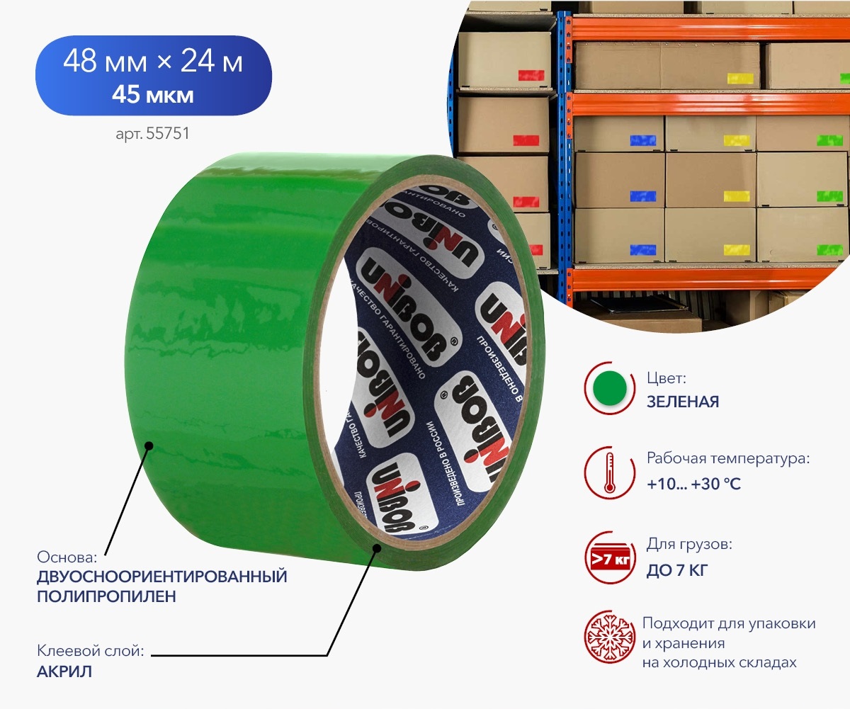 Клейкая лента упаковочная 48мм*24м UNIBOB 600 ЗЕЛЕНАЯ