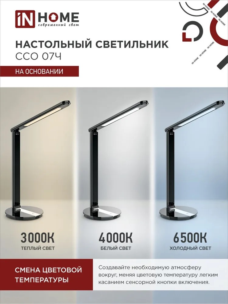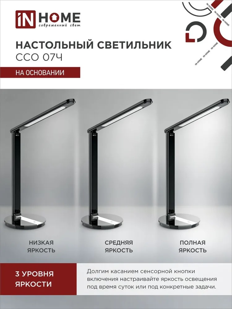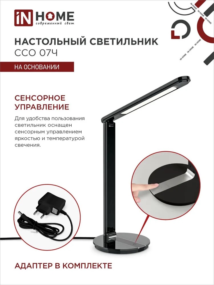 Светильник настольный светодиодный ССО 07Ч 12Вт 600Лм сенсор 3 уровня яркости, с адаптером ЧЕРНЫЙ IN HOME