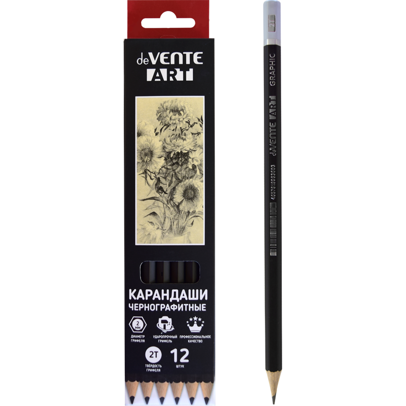 Карандаш ч/гр deVENTE Art 2Т, диаметр грифеля 2 мм, шестигранный, заточенный, корпус черный с топом, в картонной коробке