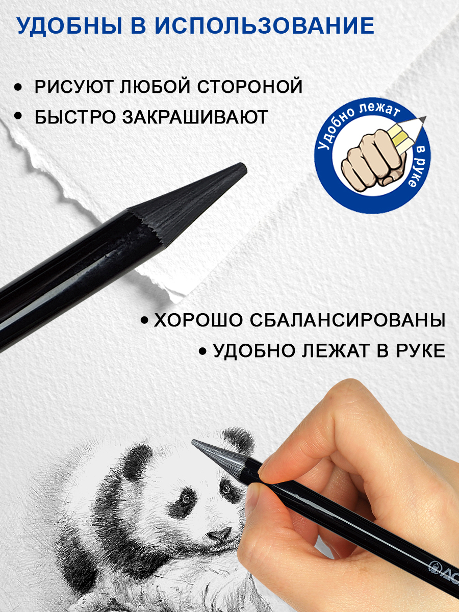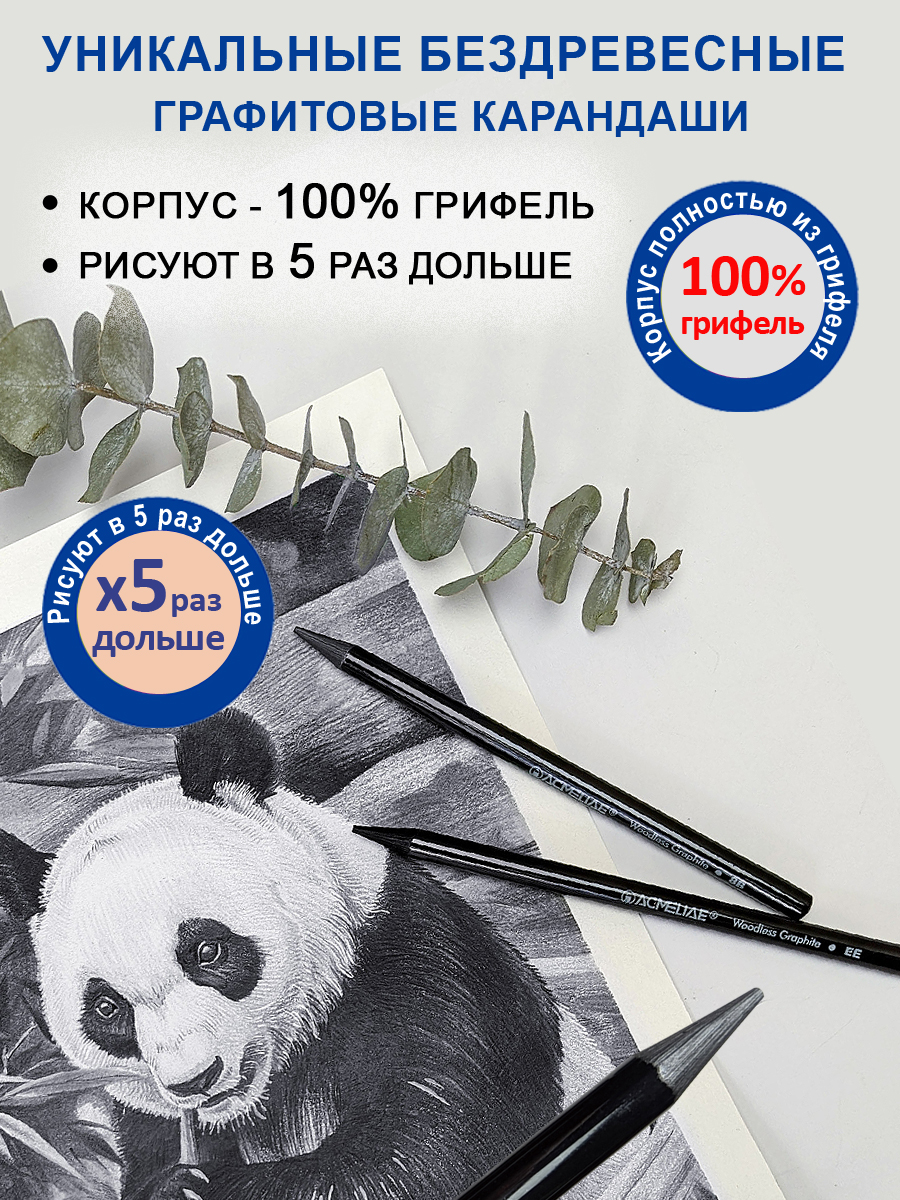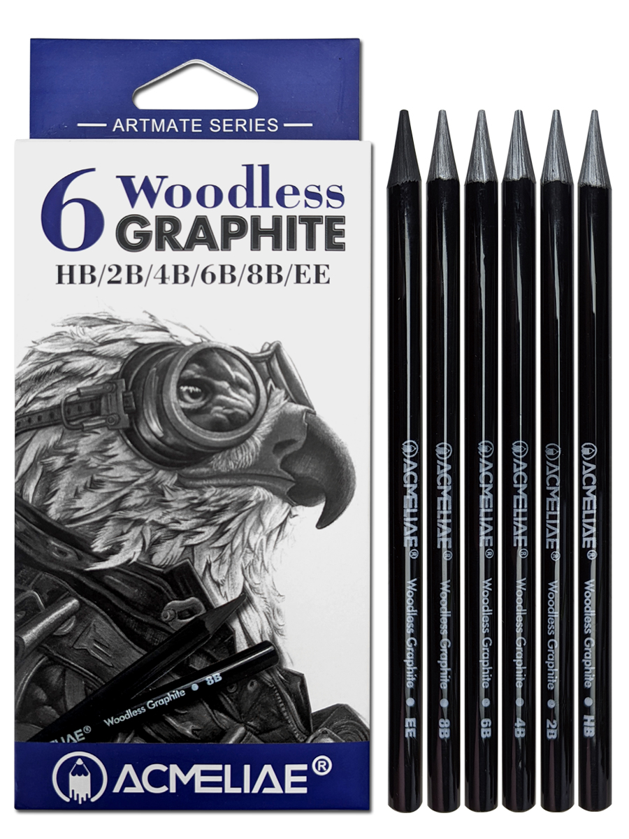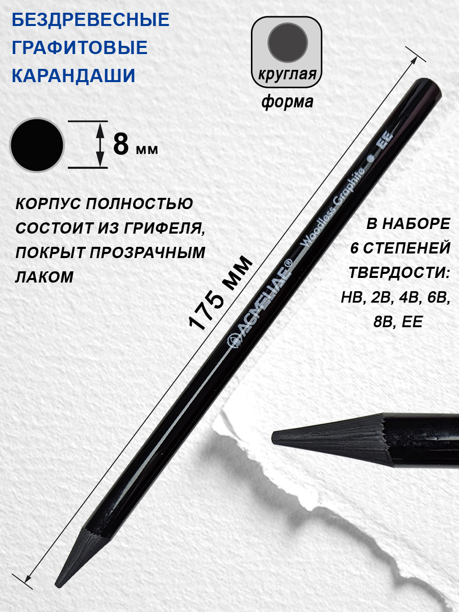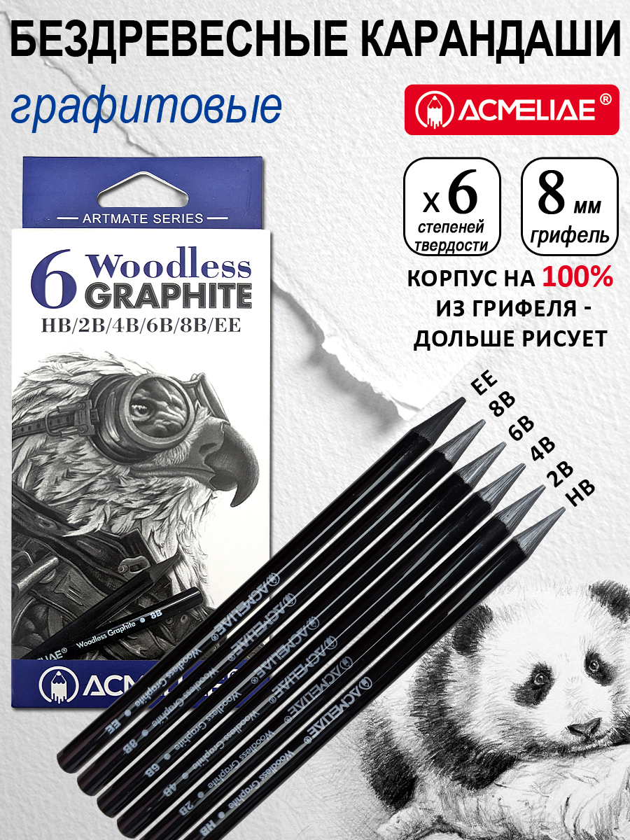 Набор бездревесных чернографитных карандашей 6 твердостей премиум класса для скетчинга, рисования, письма. Это уникальные карандаши, в которых нет деревянной оболочки как в традиционных карандашах. Корпус целиком – это грифель с тонким лаковым покрытием, поэтому не пачкает руки. Обеспечивает рисование любой стороной и быструю штриховку. Карандаш можно использовать под небольшим углом для заполнения широких областей, что делает его идеальными для разных стилей рисования. Бездревесные карандаши Acmeliae содержат в пять раз больше пигмента, чем обычный карандаш. Это в пять раз больше возможностей для рисования и меньше циклов затачивания. Они отлично сбалансированы, приятно чувствуются в руке. Идеальны для графики, растушевки, создания широких или тонких штрихов. Набор включает 6 графитовых карандашей разной твердости HB-2B-4B-6B-8B-EE, способных создавать темные, светлые и едва заметные эффекты растушевки. Легко стираются ластиком. Подходят для художников, студентов, профессионалов и любителей. Карандаш ЕЕ состоит на 50% из графита и на 50% из древесного угля. Для затачивания подойдет обычная точилка или канцелярский нож. Для большей точности используйте наждачную бумагу. Круглый корпус. Экологически чистые и безопасные. Упаковка выполнена из плотного картона. Пластиковый лоток внутри удерживает карандаши на месте и предотвращает их перемещение. Компактный размер коробки – удобно брать с собой.