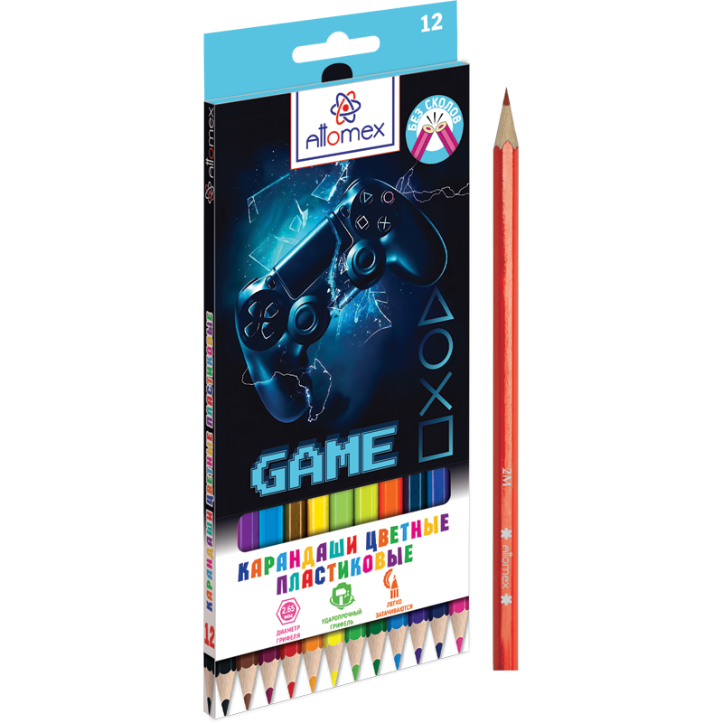 Карандаши цветные пластиковые "Attomex. GAME 12 цветов, 2М, диаметр грифеля 2,65 мм, шестигранные, в картонной коробке