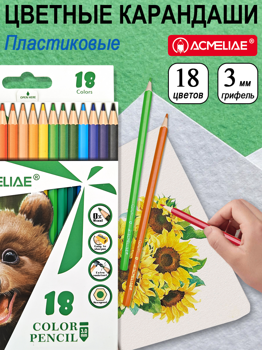 Карандаши цветные пластиковые ACMELIAE 18цв. шестигранные, грифель 4мм в картонном футляре