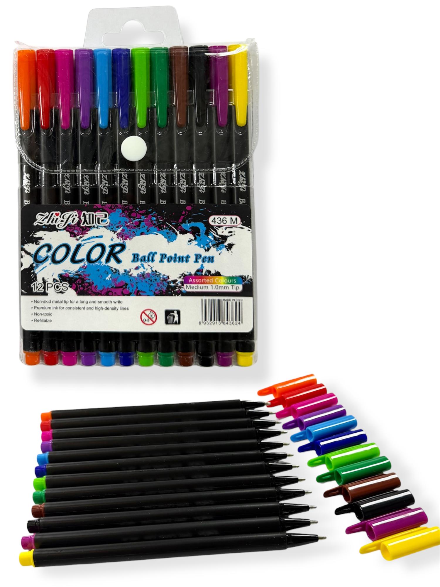Набор масляных ручек 12цв черный трехгранный корпус, цв.колп в цвет чернил, 1мм в блистере с европодвесом