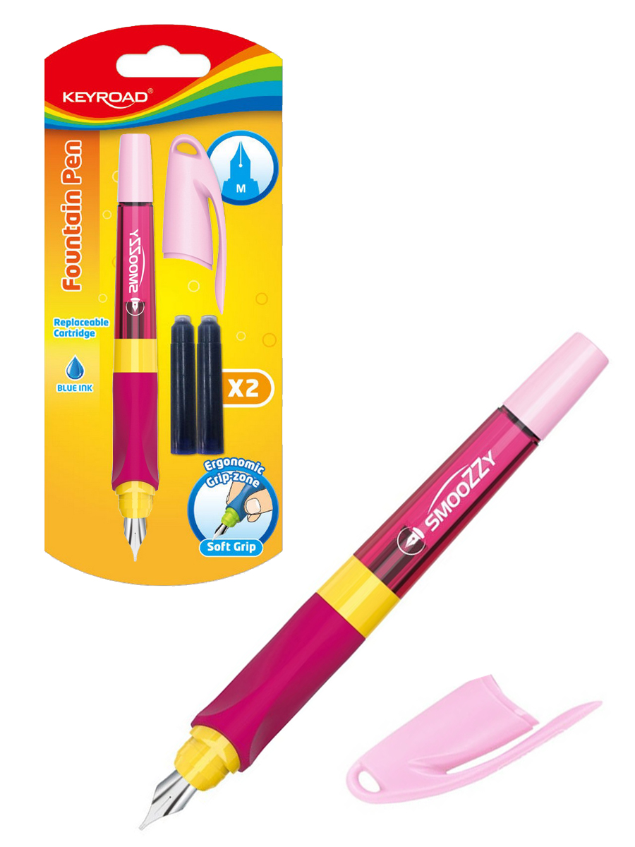Перьевая ручка Keyroad Smoozzy - это стильная и удобная модель, которая доставит настоящую радость от письма. Чернила для перьевой ручки идеально ложатся на любую бумажную поверхность, создавая изящные линии и формируя идеальный почерк. Толщина линии 0,6 мм и иридиевый наконечник обеспечивают мягкое, ровное письмо и подходит для каллиграфии. Писать этой ручкой легко и приятно, нажим не требуется. Эргономичный трехгранный грип гарантирует удобный захват и легкость использования для детей. Ручка перьевая оснащена смотровым окошком для контроля уровня чернил. На колпачке имеется отверстие для подвешивания. Картридж с синими чернилами находится внутри корпуса ручки, поэтому её сразу можно использовать после получения. В набор дополнительно входят 2 картриджа с синими чернилами. Перьевые ручки - необходимая канцелярия для школы, дома и творчества. Подарок для учителя, подростков, художников, школьника, воспитателя. KEYROAD - инновационный, школьный бренд и крупнейший поставщик канцелярских принадлежностей