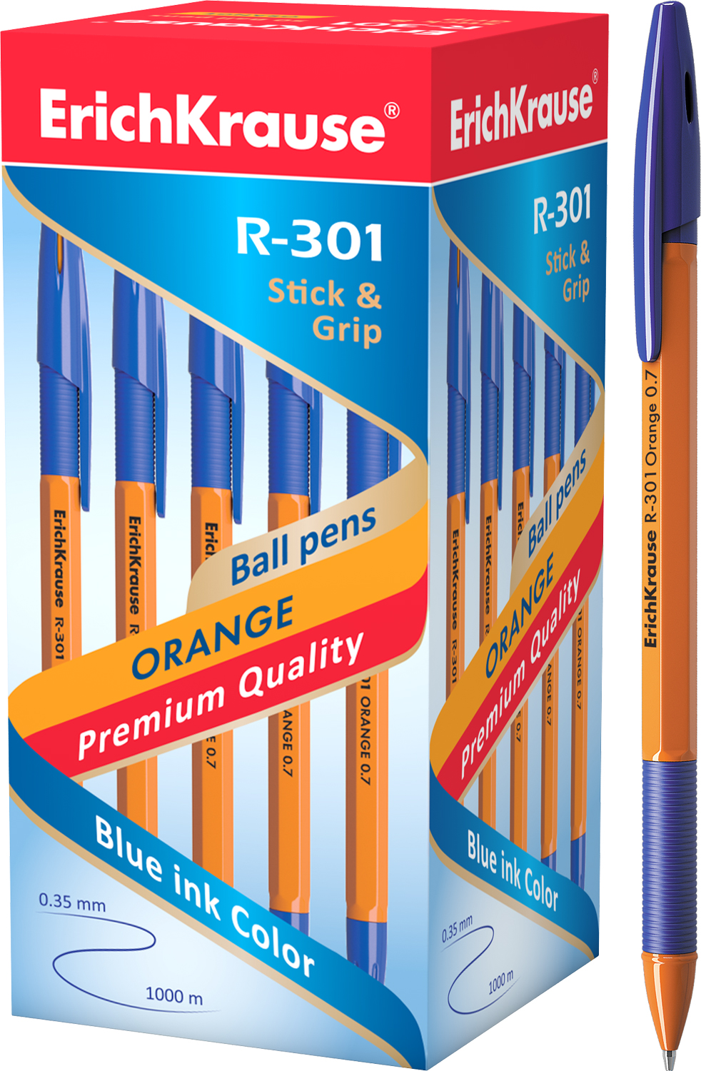 Ручка шар. E.KRAUSE R-301 ORANGE Stick&Grip оранж.корпус с резин.синим держ, 0,7 (толщина линии 0,35), синяя