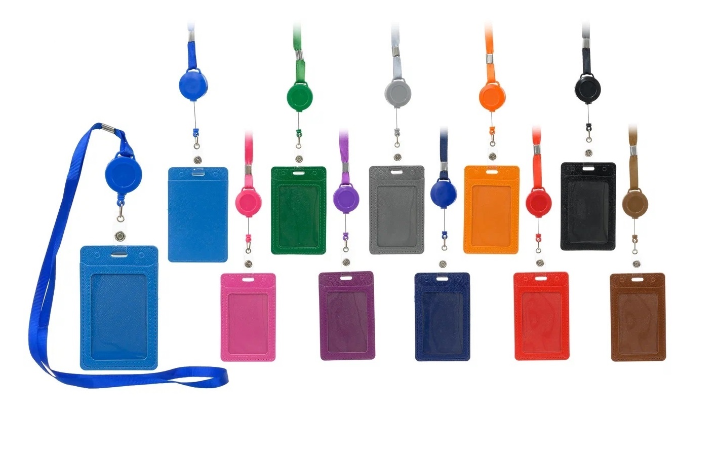 Бейдж вертикальный на рулетке с лентой, кожзам, 10,5*6,5см цв.ассорти, два карманчика