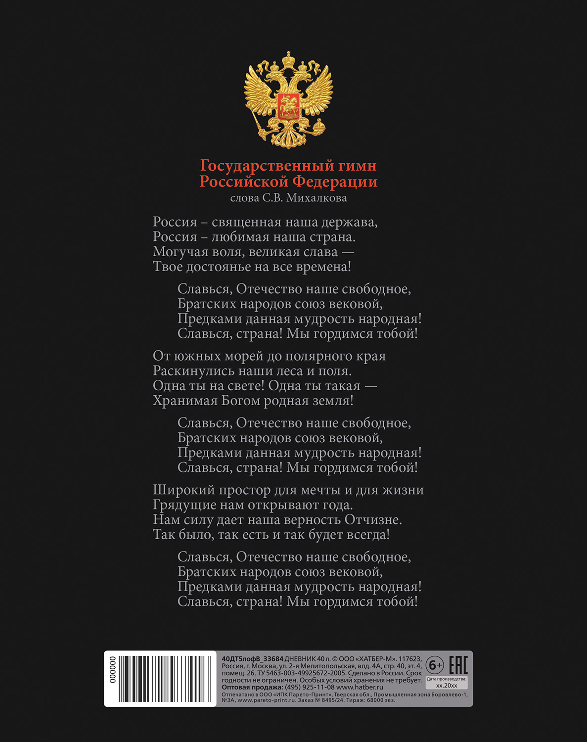 Дневник для 1-11кл. 40л А5ф тв.переплет запечат. форзац ламинац.Soft-touch 3D лак-Россия- с гимном