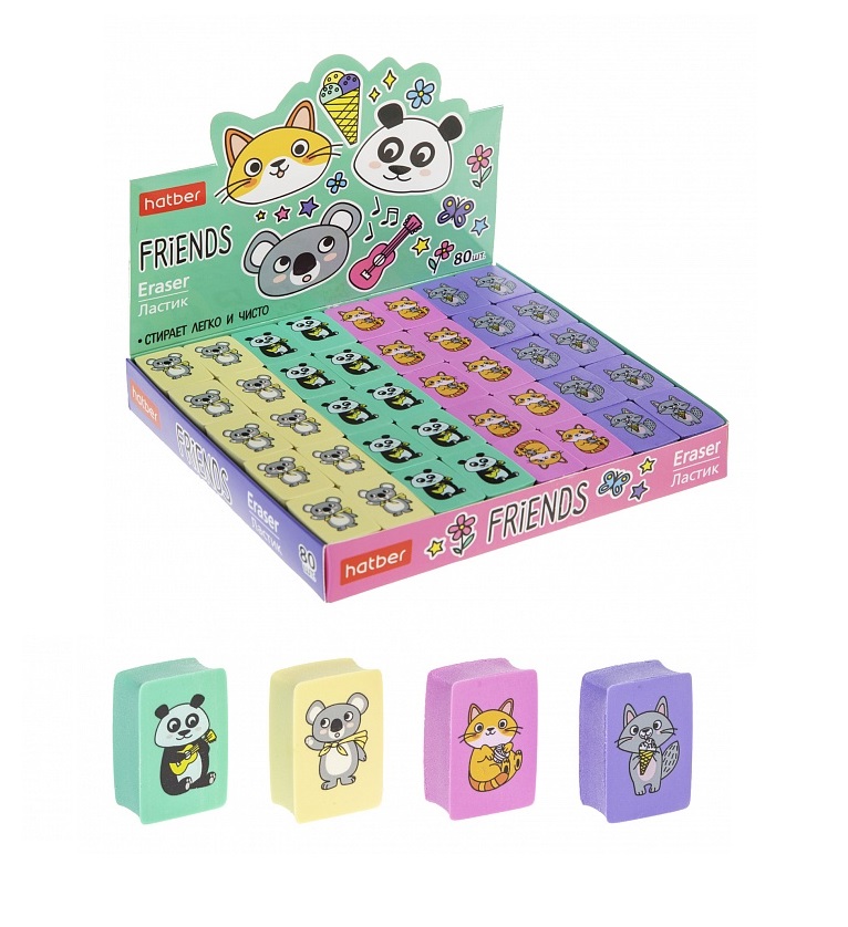 Ластик Hatber Friends цветной 28х18х9 мм из термопластичной резины, в картонной Дисплей-витрине