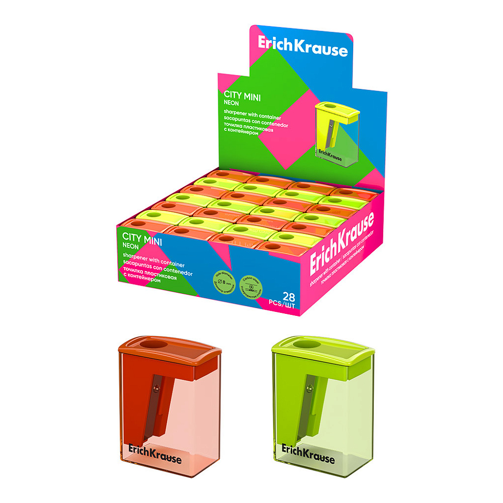Точилка пластиковая ErichKrause City Mini, Neon, с контейнером, ассорти