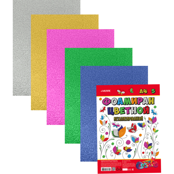 Фоамиран цветной металлизированный A4 "deVENTE" 5 цв, 5 л, толщина 2 мм, пластиковый пакет с европодвесом