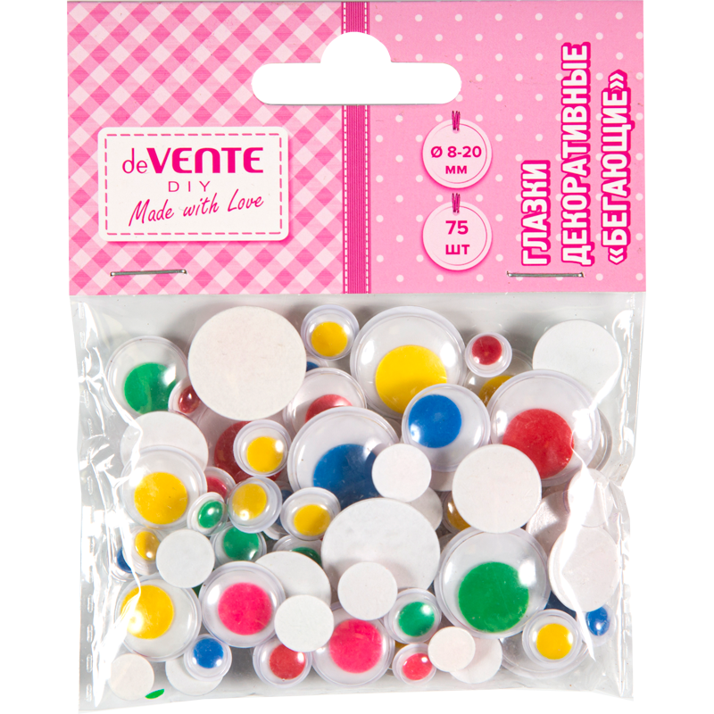 Глазки декоративные "deVENTE. DIY" 75 шт (8 мм - 20 шт, 10 мм - 25 шт, 15 мм - 20 шт, 20 мм - 10 шт) круглые пластиковые, самоклеящиеся, с подвижной вставкой, в пластиковом пакете с блистерным подвесом