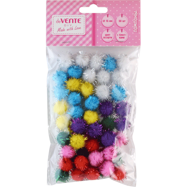 Набор помпонов для творчества "deVENTE" 15 мм, 50 шт, с блестками, ассорти цветов, в пластиковом пакете с блистерным подвесом