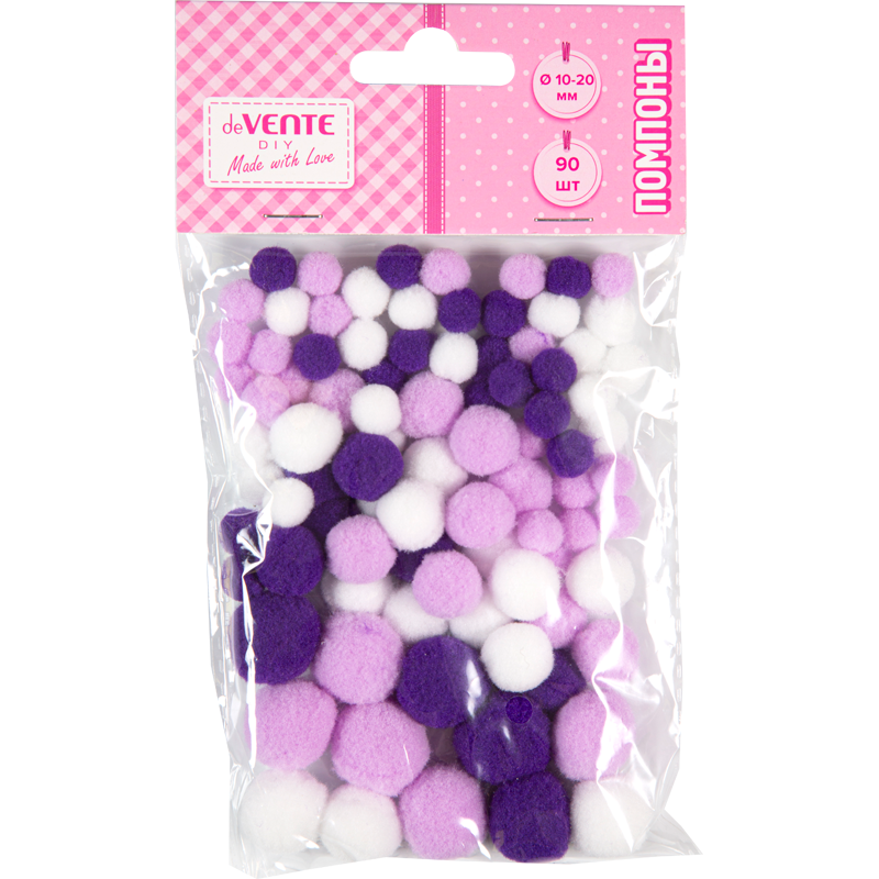 Набор помпонов для творчества "deVENTE. DIY" 90 шт, ассорти размеров и цветов (10 мм - 54 шт, 15 мм - 24 шт, 20 мм - 12 шт) в пластиковом пакете с блистерным подвесом, оттенки лилового цвета