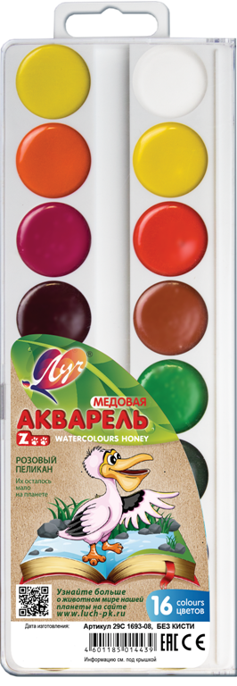 Краски акв. медовые ЛУЧ "ZOO " 16 цв.б/к, пласт. упак.(европодвес)