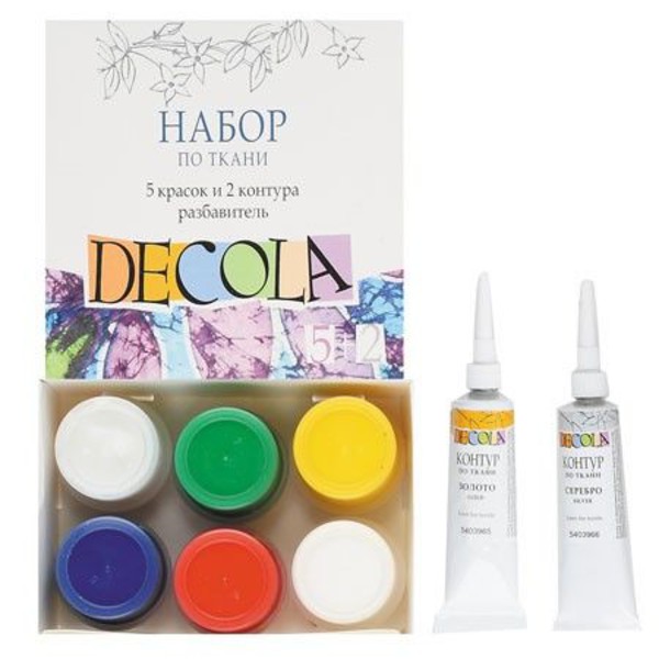 Краски акрил по ткани "Decola" 5*20мл, контуры в тубах 2*18мл, разбавитель