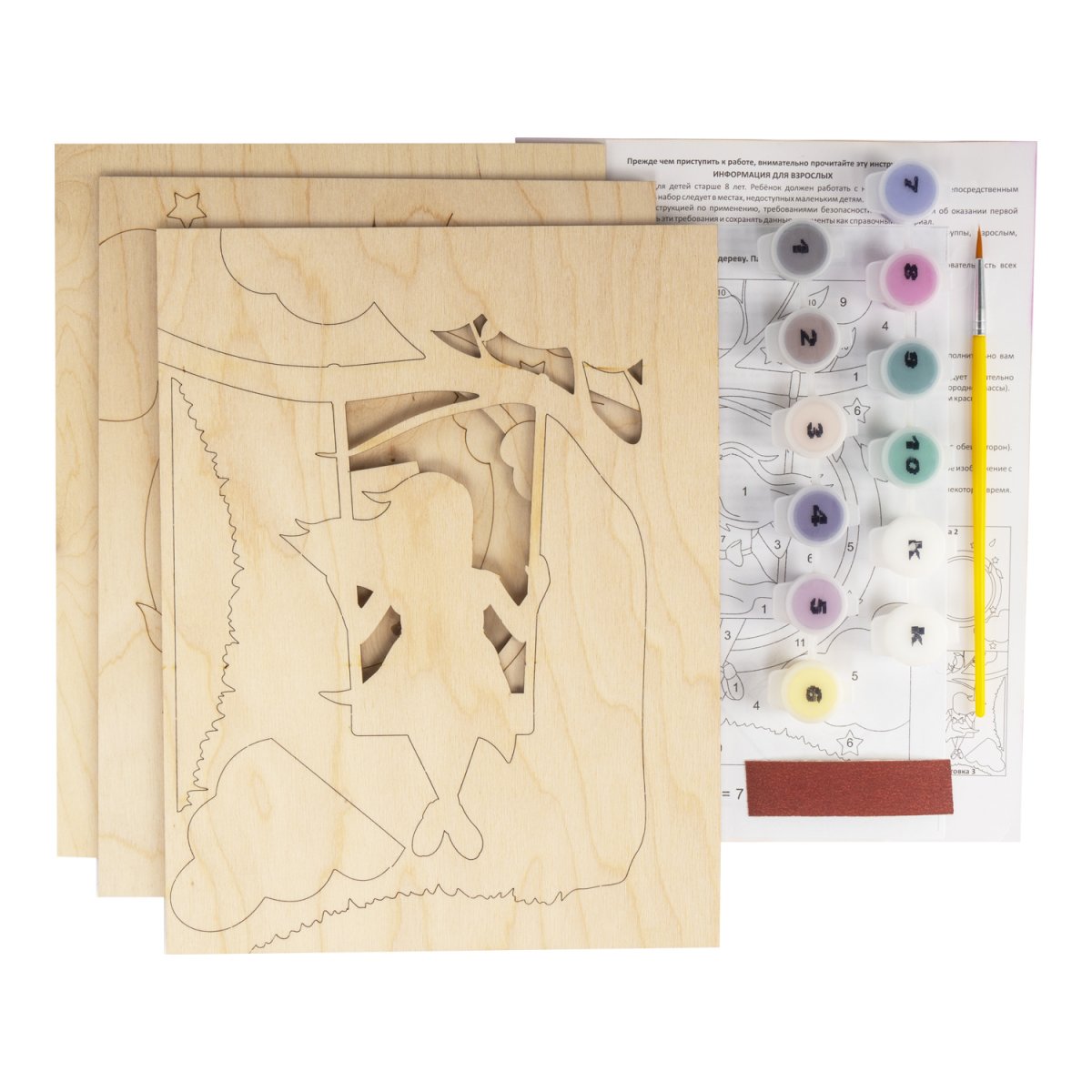 Комплектация: Деревянные заготовки, краски, клей, наждачная бумага, кисть, инструкция.