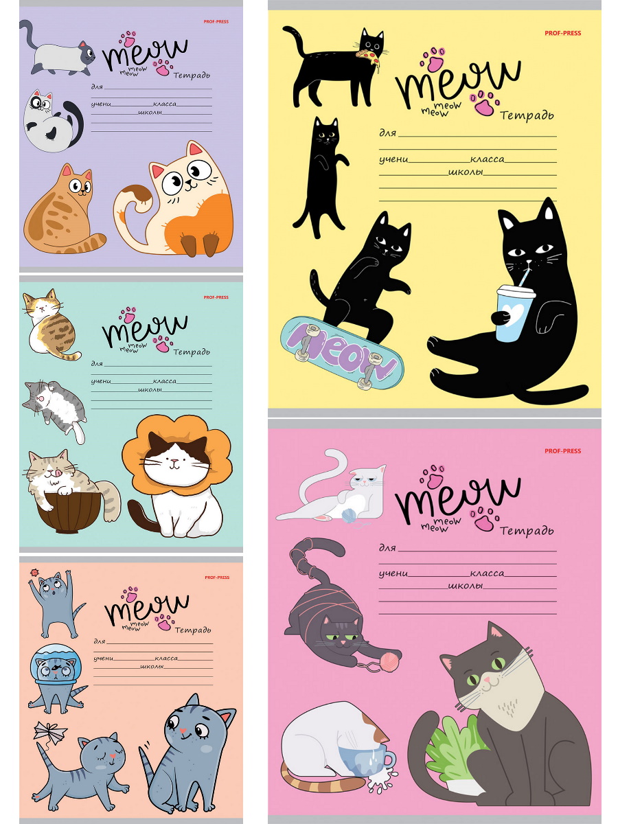 Тетрадь А5 18л клетка ТАКИЕ РАЗНЫЕ КОТИКИ - 1 цвет.мелов.обл.,5 дизайнов в спайке