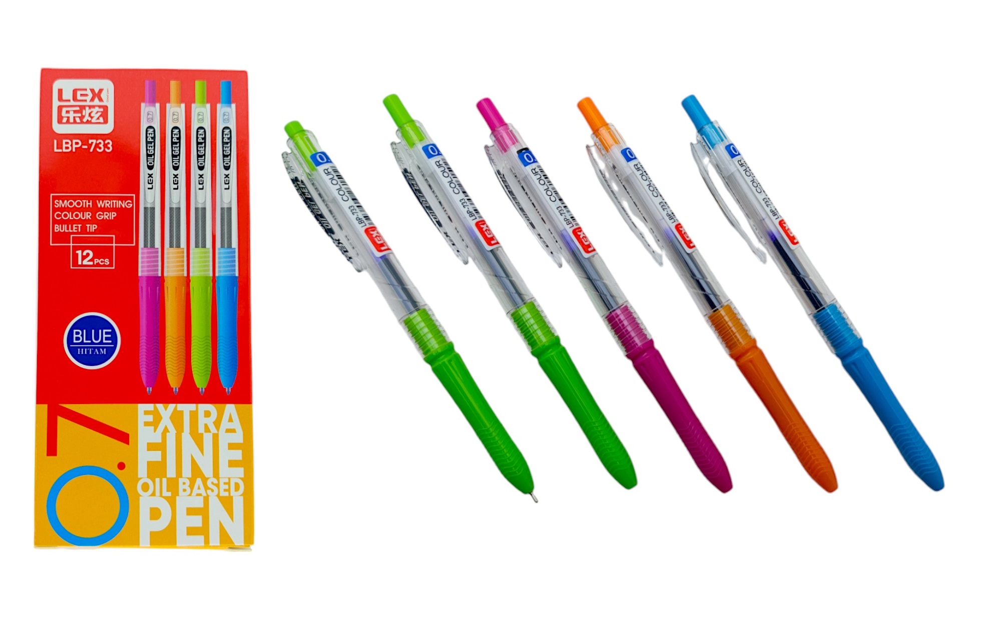 Ручка масляная автомат прозрачный корпус, цветной рифленый держатель, игольч 0,7мм, синяя