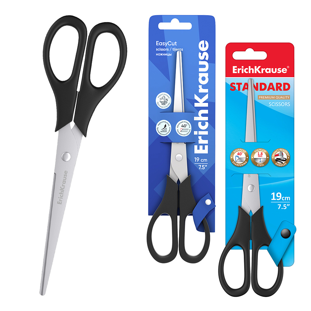 Ножницы ErichKrause EasyCut, 19см черные, ручки из пласт повыш прочности, на блистере