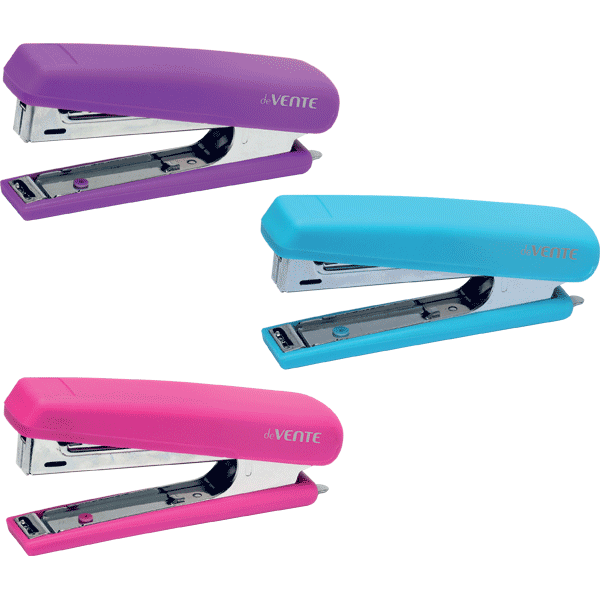 Степлер deVENTE Soft Touch №10 (до 12л, глубина скреп 50 мм) пласт с бархатистым прорезиненным покрытием, с антистеплером, в к/к, ассорти 3 цвета (фиолетовый, голубой и розовый)
